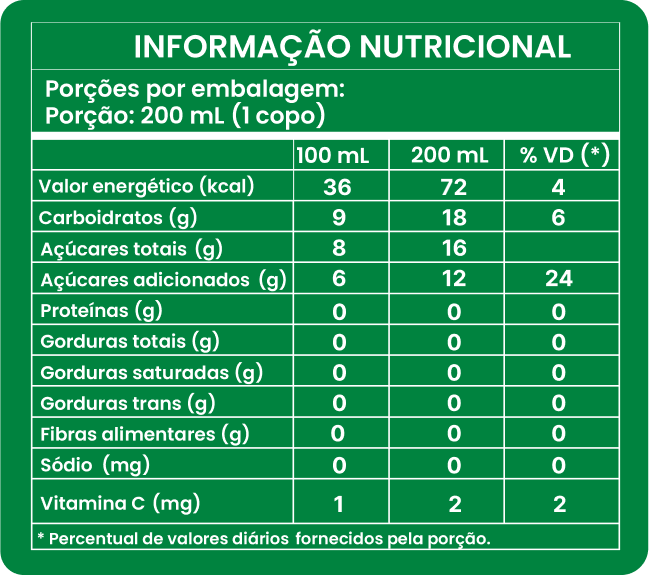 A limonada adoçada, é obtida da dissolução em água potável (tratada e filtrada), da parte comestível do limão (10,5% de suco integral de limão) e adição de açúcar líquido invertido. Não fermentado. Não alcoólico. NÃO CONTÉM GLÚTEN.